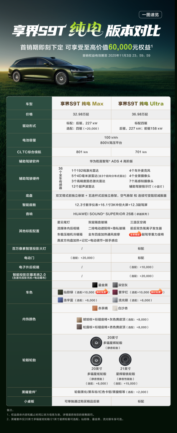 在首销期,享界 S9T限时推出至高6万元的专属权益。其中包括价值1万元的仙踪绿/寰宇红外饰限免、1万元选配优惠、1万元副驾零重力座椅、2万元ADS功能包补贴,以及价值6000元的舒享用车礼包与4000元的辅助驾驶无忧服务。这一权益组合,直击用户购车痛点,进一步增强了产品的吸引力。